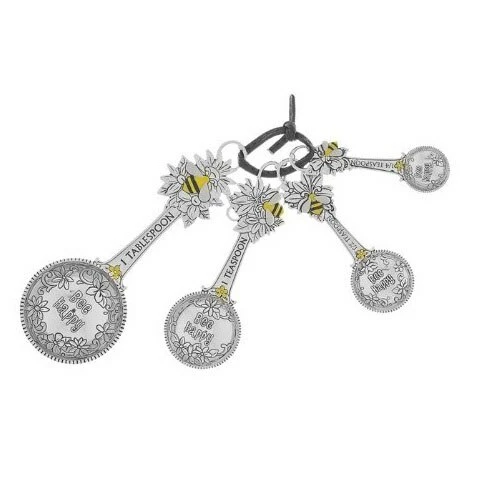 The Ganz bee happy measuring spoons bring a bit of whimsy to any kitchen with painted busy bees. These spoons provide a unique combination of style and function. The spoon set includes a 1/4 teaspoon (3 inch), 1/2 teaspoon (3.25 inch), 1 teaspoon (4 inch), and 1 tablespoon (5.25 inch).