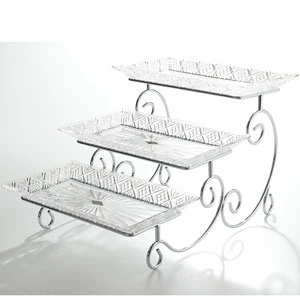 Godinger Dublin crystal three tiered rectangle server. Elegant 24% European lead crystal in Godinger’s best selling Dublin pattern. Set includes three 12″W x 6.5″D rectangular trays and one silver finish (tarnish resistant) serving rack. The serving rack measures approximately 12″W x 17″D x 9.8″H, and the server (including trays) weighs approximately 7.4 pounds. Hand washing is recommended.When ordering multiples of this item, additional shipping fees may be charged. Before levying such charge, we will contact you with the proposed amount of the charge. If you do not want to accept the surcharge, we will cancel your order without any penalty to you.Order Information